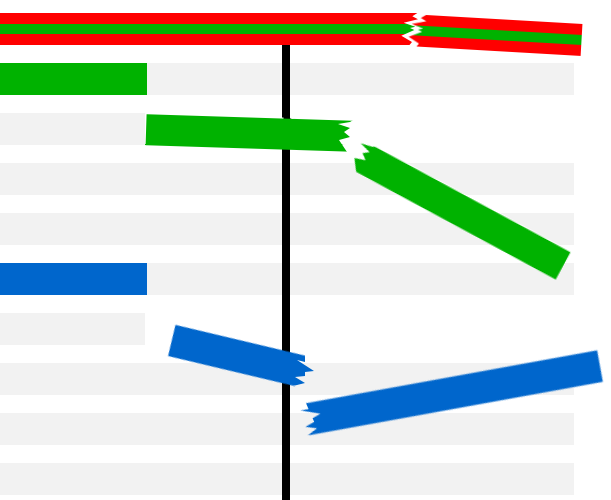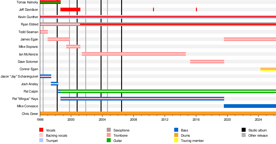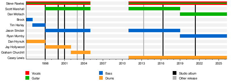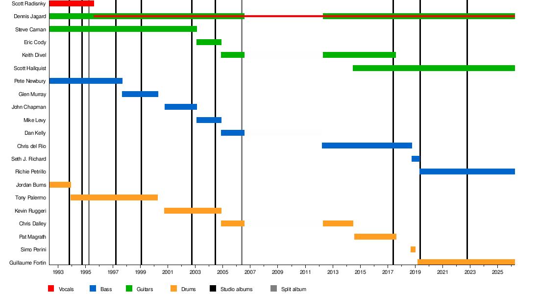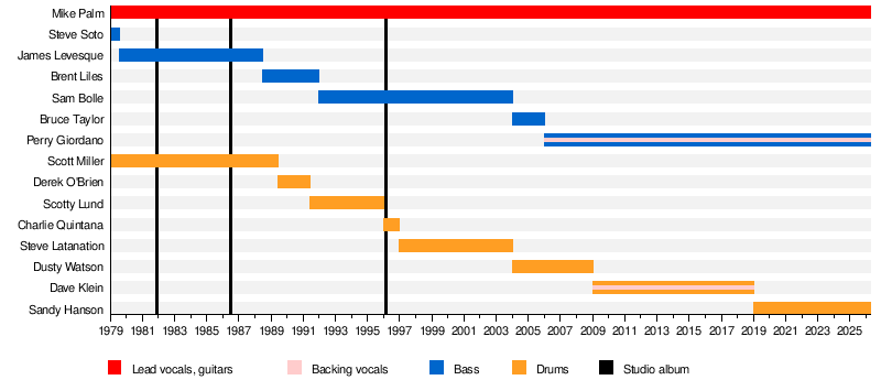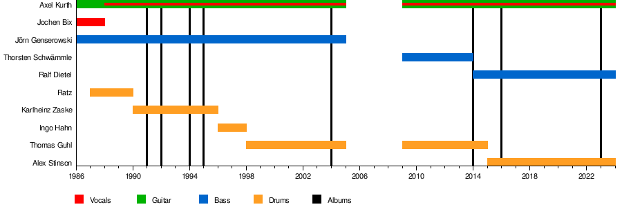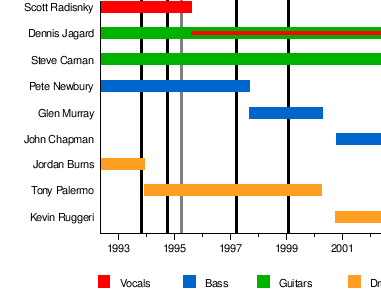 I don't mythologize "founding members" or "classic lineups" or anything like that. The whole reason this interests me is because I am curious about how bands evolve. I consider bands to be a social bond of several artists, and when suddenly that entire social bond is swapped out, the old social bond is gone and a new one exists. Even if the new one exists in the place of the old one, it's a new bond, the old one doesn't exist anymore. But a social bond can survive individuals leaving and new ones joining, so that over time, the group that makes up that bond changes, but that doesn't mean it is completely replaced from one moment to another. This means that I can accept bands that, over a longer time period, switch out every single individual member, if, in the meantime, a remaining consistent part of the group can establish itself as a coherent social bond. Or, to make a much sillier comparison to explain what I mean: Imagine the bars from the Wikipedia charts are wooden boards that are glued together. Would the construction fall apart, or is there enough overlap to have structural integrity?