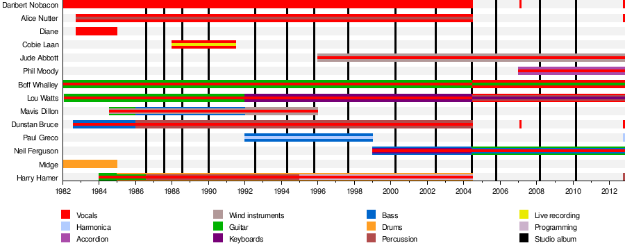 For example, looking at Chumbawamba, the most noticeable thing here is that about half the members leave all at once in 2004. Out of context I would assume a huge falling out, some sort of schism on the creative direction that split the band apart. But being very familiar with the band, I know that this was one half of the band retiring on good terms to step away from full-time band business, and the remaining half shifting focus onto folk, a style of music that has been an important influence on them since the very beginning. The retired members even returned for the band's ultimate retirement, the farewell show in Leeds in 2013. So despite half the members missing and the sound of the band going through a noticeable change, I know how the two sides of the band's history connect and what motivated this move.