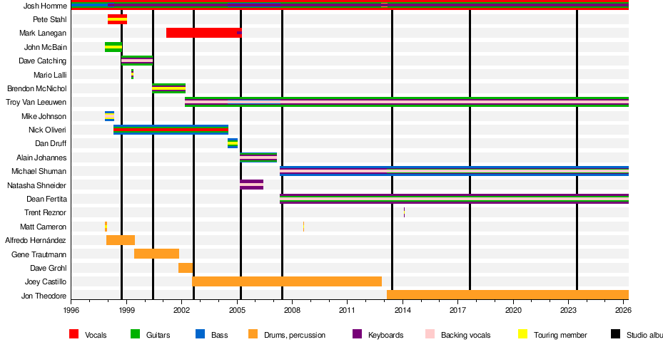 Queens of the Stone Age to me are a classic example of a well respected, consistently good band, that is kind of more of a solo project. Formed and fronted by former Kyuss guitarist Josh Homme, this band recorded many classic, widely beloved albums, all with a completely different lineup. Different members contributed creatively, for example bassist Nick Oliveri and second singer Mark Lanagan both wrote songs along with occasional lead vocal duties, so it's not a case where the lead singer dictates the entire creative direction of the band. Nonetheless, the lineup changes this band went through were very frequent, and the band has many different albums that fans point to as their best, yet I rarely ever heard anyone even mention any lineup changes, let alone voice an opinion on them. Josh Homme is there, so it's all good.
