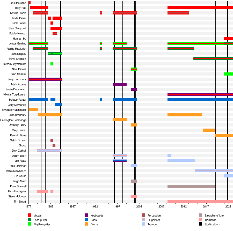 You ever seen the fucking Specials' member timeline? Yeah I don't know what the fuck is going on here. There are bands with longer members lists than The Specials, such as the Dexys (Midnight Runners), but they are more of a solo project and members come and go. What I find interesting about The Specials is that there is no identifiable core and the lineup is in constant flux, shifting around, but somehow always recognizable. It's like there's a pool of 20 or so musicians that might make up The Specials and they exit and enter at random. Picking out a Specials release or a live show from a random year, you'll have no idea who's gonna be on there. But you can be pretty sure it's probably at least one or two you'll recognize. It's so chaotic I almost can't help but respect it. Given the history of the band, I was honestly quite surprised that the passing of Terry Hall ended up causing the band to ultimately call it quits, when he hasn't even been with the band for a major part of their career. But I suppose that after continuing through a history as chaotic as The Specials', the tragedy of the death of a major contributor is a good reason to finally put the band to rest after so long. Or maybe they'll reunite in a few years, who knows.